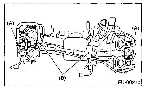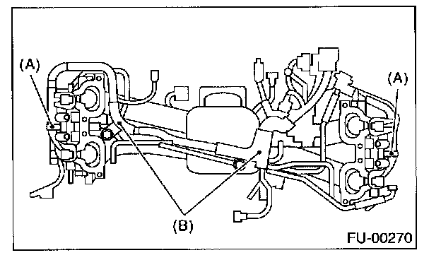 12. Remove the harness bands (A) and harness bracket (B) which hold engine harness onto the intake manifold.