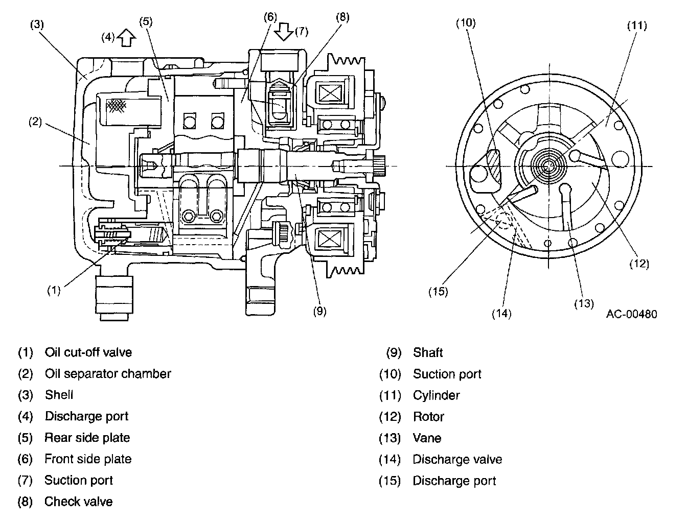 As the rotor turns, the vanes that are movally fitted in the rotor slide over the wall of the oval-shaped cylinder while drawing, compressing, and discharging refrigerant gas.