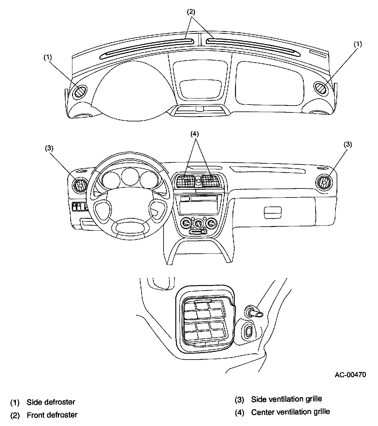 - There are three ventilation grilles in the dashboard; a trapezoidal grille at the center and round grilles at both sides. The side grilles are rotatable for air flow direction adjustments.