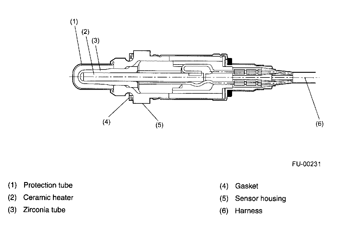 - The rear oxygen sensor has a zirconia tube (ceramic) which generates voltage if there is a difference in oxygen ion concentration between the inside and outside of the tube. Platinum is coated on the inside and outside of the zirconia tube as a catalysis and electrode material. The sensor housing is grounded to the exhaust pipe and the inside is connected to the ECM through the harness.