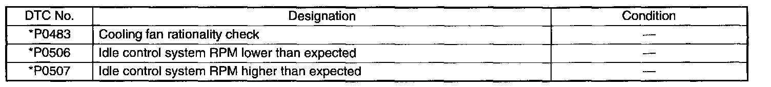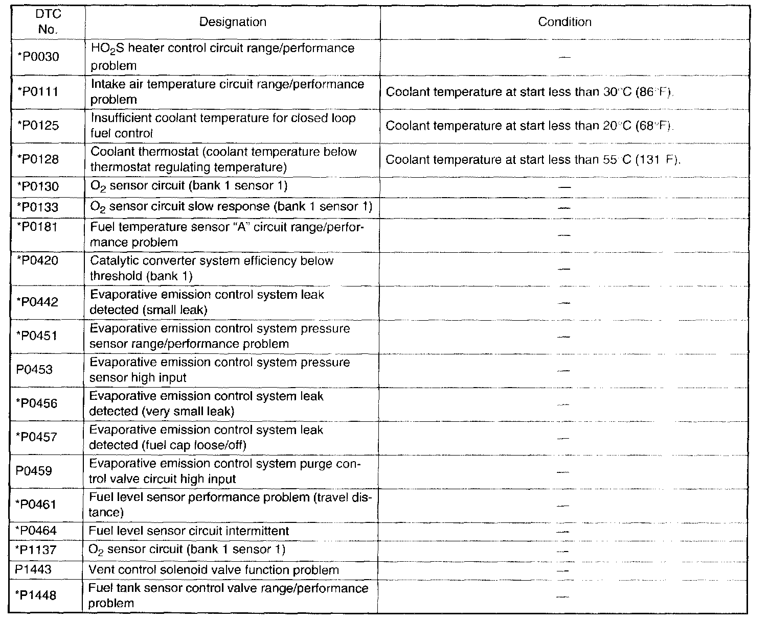 - For DTCs marked with a *, carry out the diagnosis twice. After the first diagnosis is finished, stop the engine and carry out the diagnosis for the second time under same conditions.