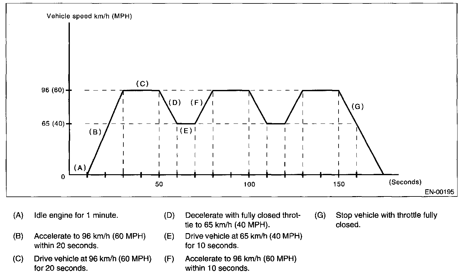 2. DRIVE AT 80 KM/H (50 MPH) FOR 20 MINUTES AND THEN IDLE THE ENGINE FOR 1 MINUTE.