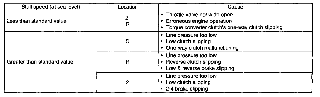 ^ If the stall speed is higher than the specified range, attempt to finish the stall test in as a short time as possible, in order to prevent the automatic transmission from sustaining damage.