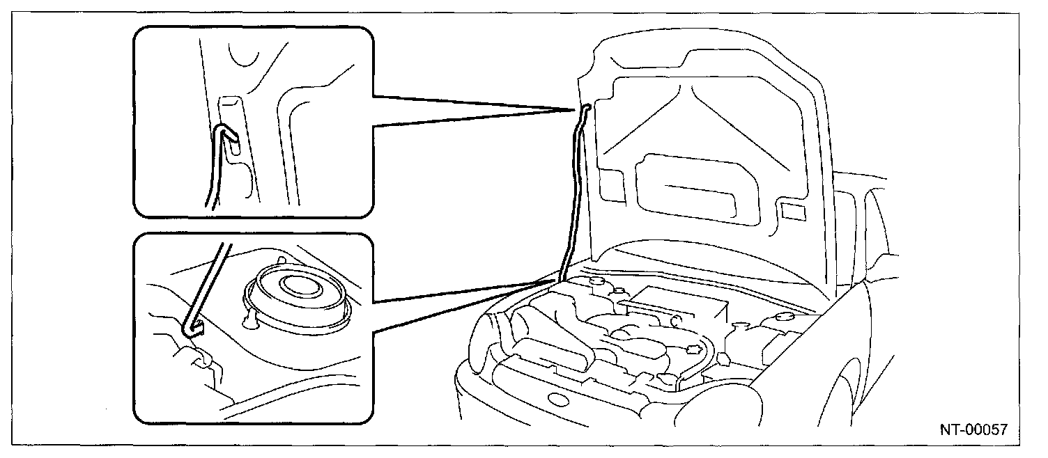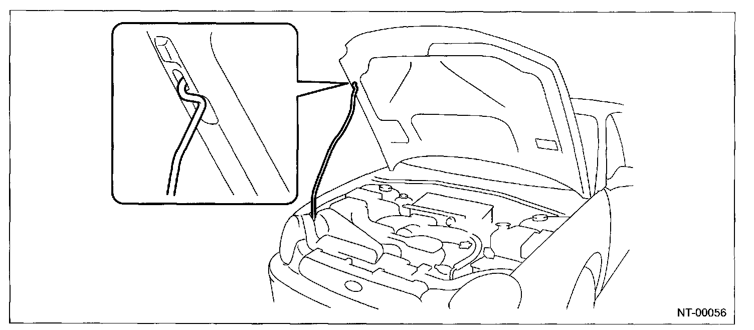 NOTE: Before setting the stay in this position, remove the rubber plug used for closing the hole in front wheel apron. Also, remove the windshield washer hose attaching clip from the hood.