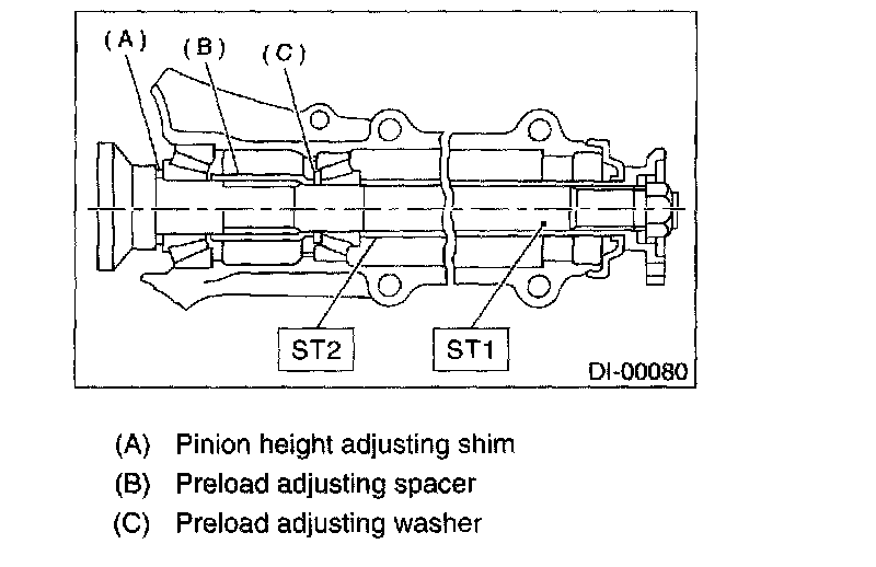 5) Turn the ST1 with hand to make it seated, and tighten the drive pinion nut while measuring the preload with spring balance. Select the preload adjusting washer and spacer so that the specified preload is obtained when nut is tightened to the specified torque.