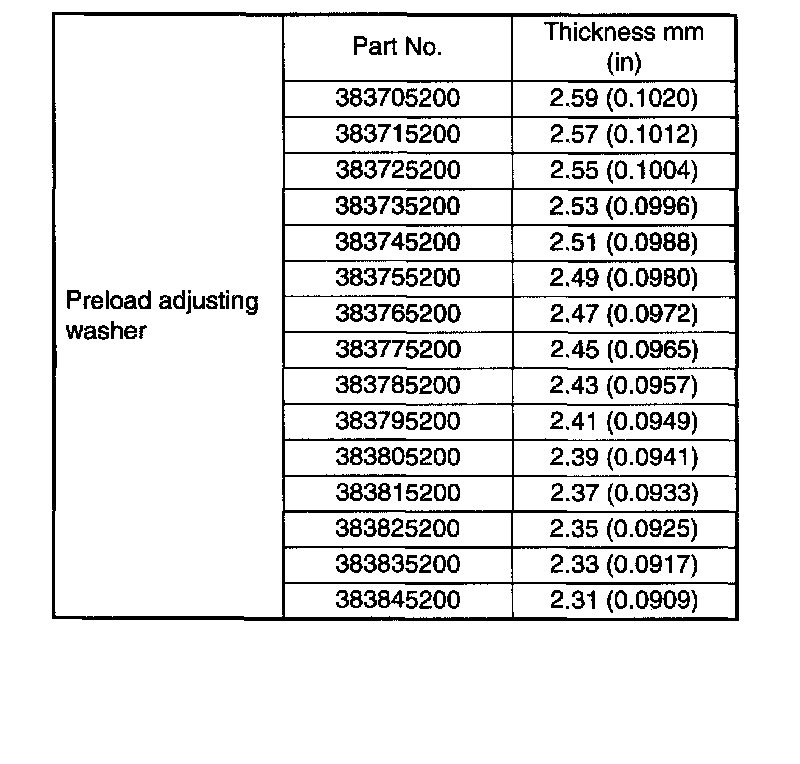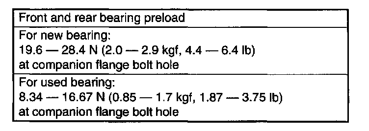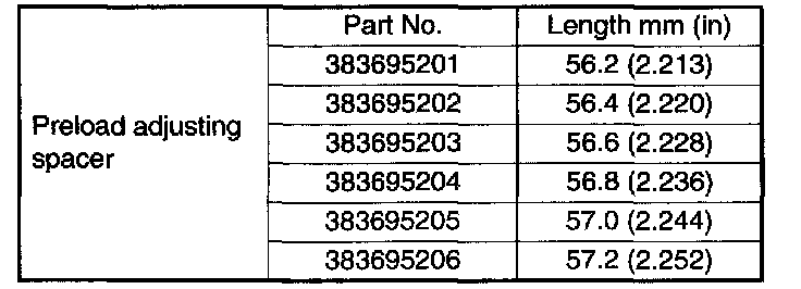 Adjust the bearing preload with spacer and washer between front and rear bearings. Pinion height adjusting washer are not affected by this adjustment. The adjustment must be carried out without oil seal inserted.