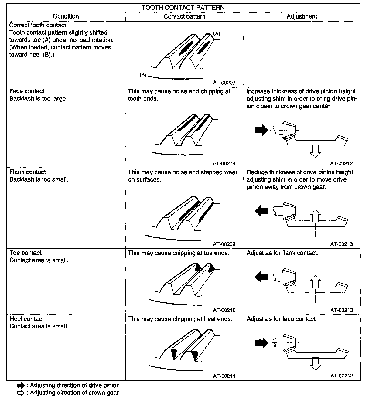 2) When the contact pattern is incorrect, readjust according to the instructions given in "TOOTH CONTACT PATTERN".