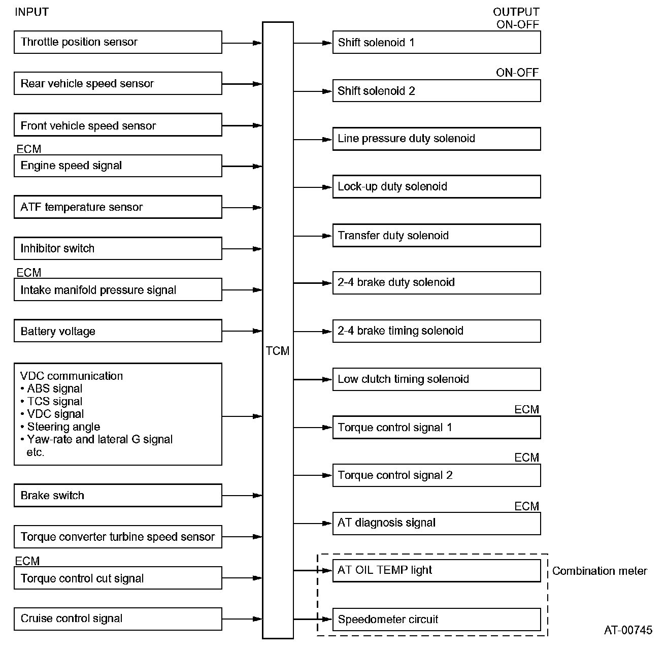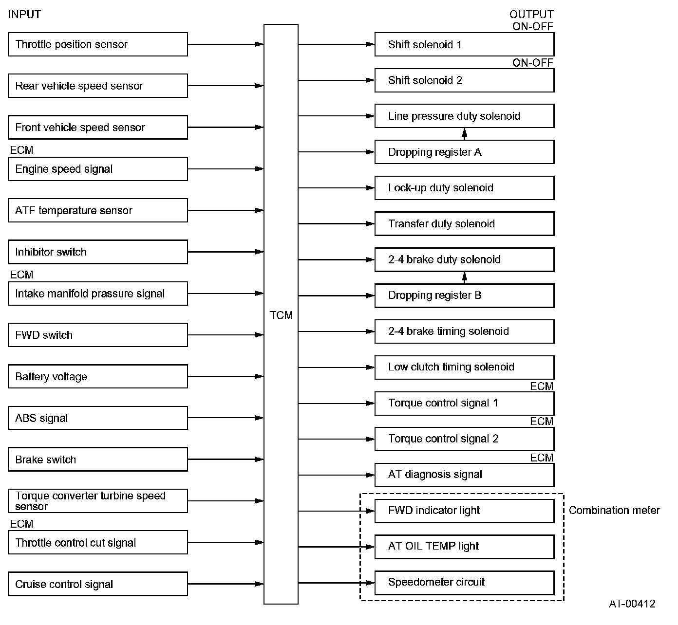 The electrohydraulic control system for the transmission and transfer consists of various sensors and switches, a transmission control module (TCM) and the hydraulic controlling units including solenoid valves.The system controls the automatic transmission operation, including gear shifting, lock-up clutch operation, line pressure, automatic control pattern selection ("Base" and "Power"), and gear-shift timing.It also controls operation of the transfer multi-plate clutch (LSD).The TCM determines vehicle operating conditions from various input signals and controls a total of eight solenoids (shift solenoids 1 and 2, low clutch timing solenoid, 2-4 brake timing solenoid, line pressure duty solenoid, lock-up duty solenoid, transfer duty solenoid, and 2-4 brake duty solenoid) by sending appropriate signals to them.