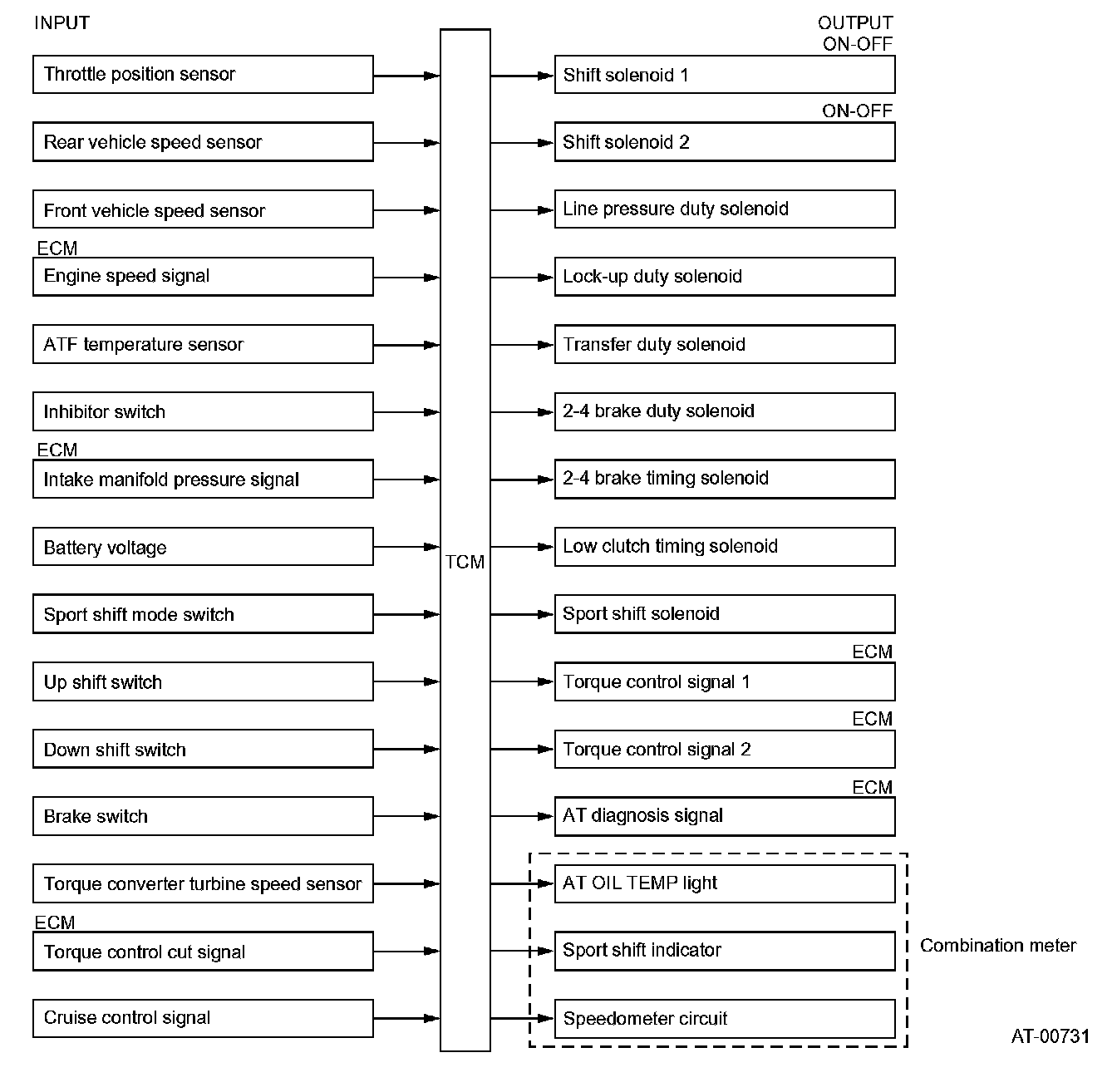 The electrohydraulic control system for the transmission and transfer consists of various sensors and switches, a transmission control module (TCM) and the hydraulic controlling units including solenoid valves.The system controls the automatic transmission operation, including gear shifting, lock-up clutch operation, line pressure, automatic shift pattern selection ("Base" and "Power"), and gear-shift timing.It also controls the operation of the transfer clutch.The TCM determines vehicle operating conditions from various input signals and controls a total of eight solenoids (shift solenoids 1 and 2, low clutch timing solenoid, 2-4 brake timing solenoid, line pressure duty solenoid, lock-up duty solenoid, transfer duty solenoid, and 2-4 brake duty solenoid) by sending appropriate signals to them.A sports shift solenoid is also equipped to make engine braking effect available when 1st speed gear is selected in sports shift mode.