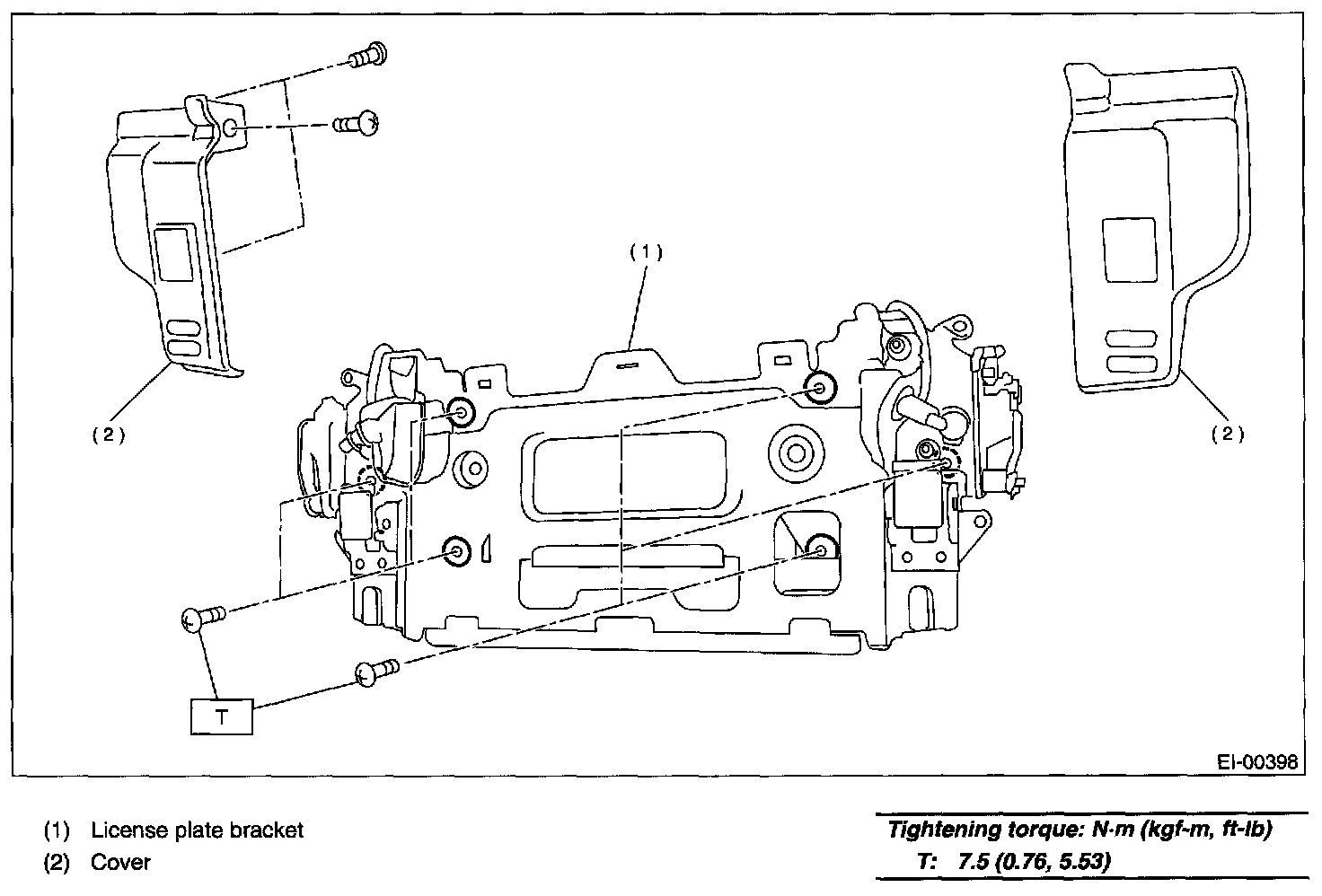 6. Lift up license plate bracket. Remove bolts using TORX(R) bit T25.