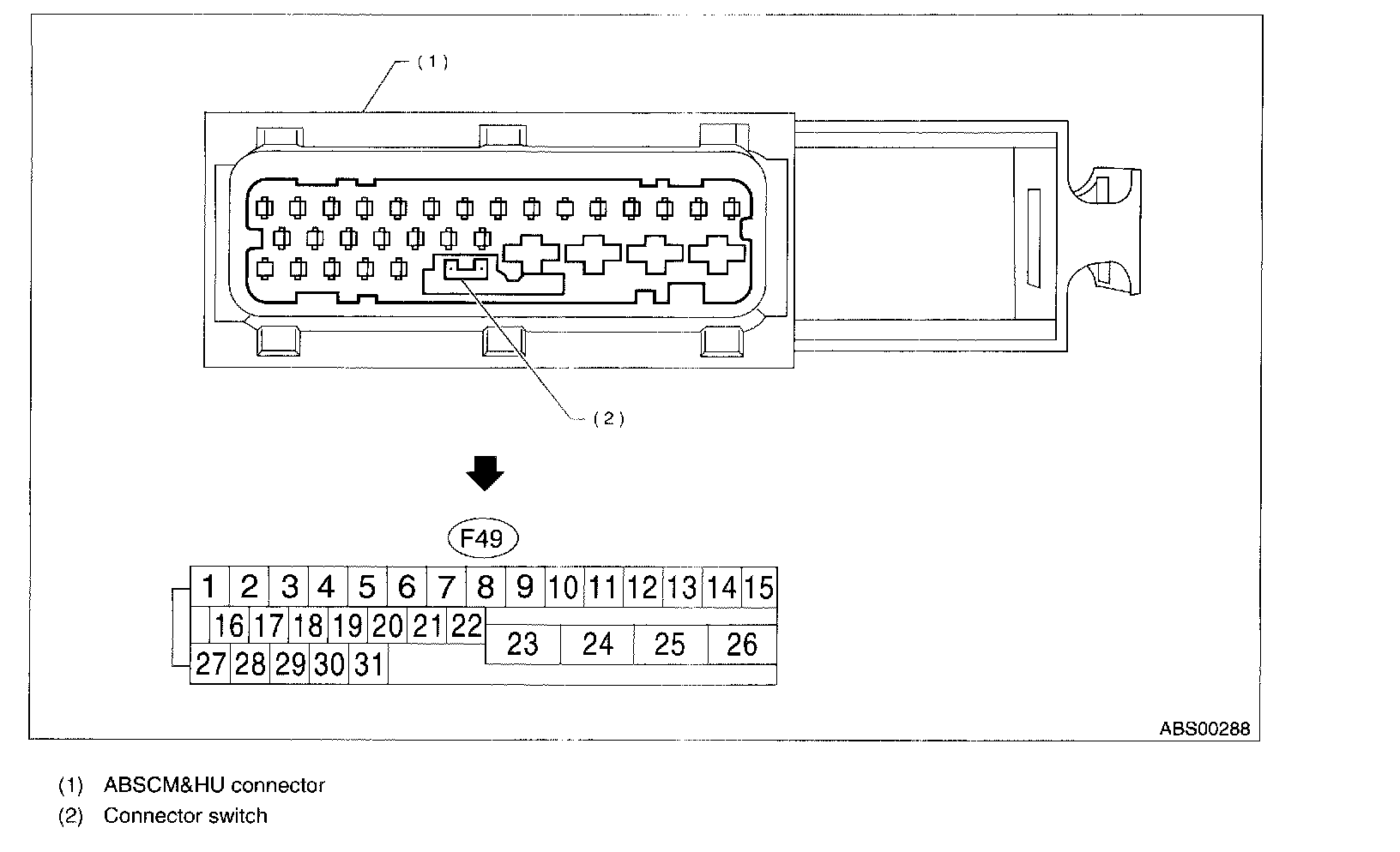 ^ When the connector is removed from the ABSCM&H/U, the connector switch closes the circuit between terminal No. 22 and No. 23. The ABS warning light illuminates.