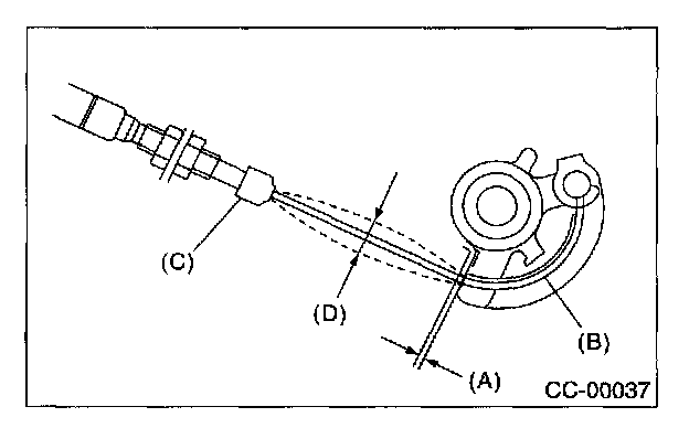 Check that the clearance (A) between throttle cam (B) and lever or cable deflection (D) is within specifications.