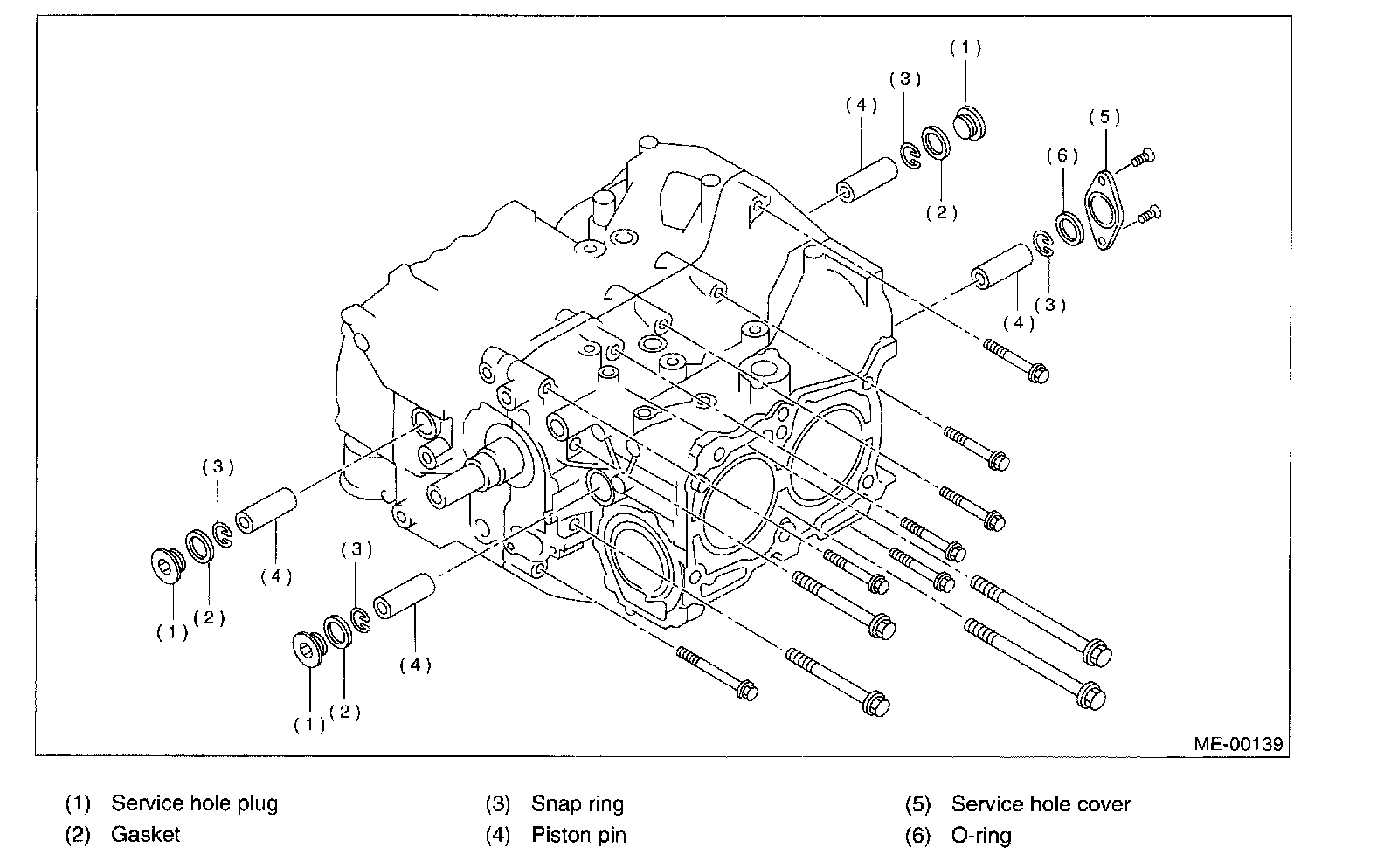 c. Apply a coat of engine oil to piston pin and insert piston pin into piston and connecting rod through service hole.