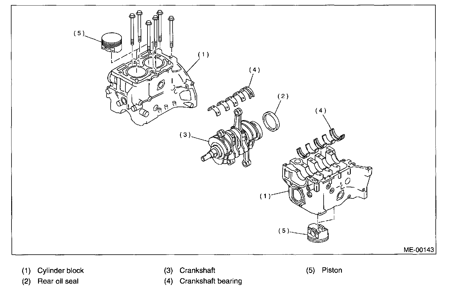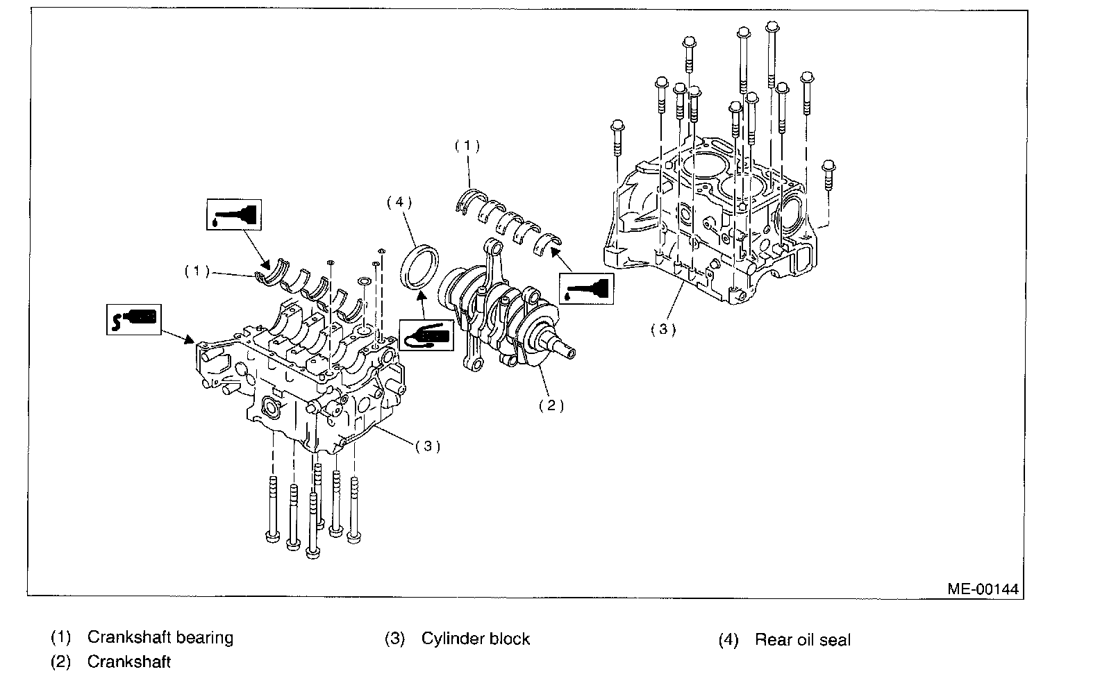 NOTE: Remove oil in the mating surface of bearing and cylinder block before installation. Also apply a coat of engine oil to crankshaft pins.