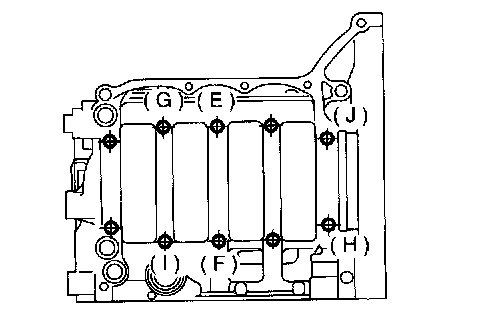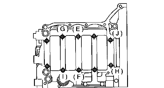6. Tighten bolts (E to J) on right side of cylinder block more 90° in alphabetical sequence.