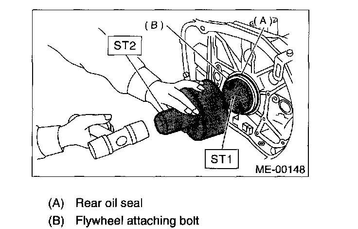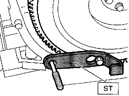 16. Remove flywheel (MT vehicles only) or drive plate (AT vehicles only). Using ST, lock crankshaft.