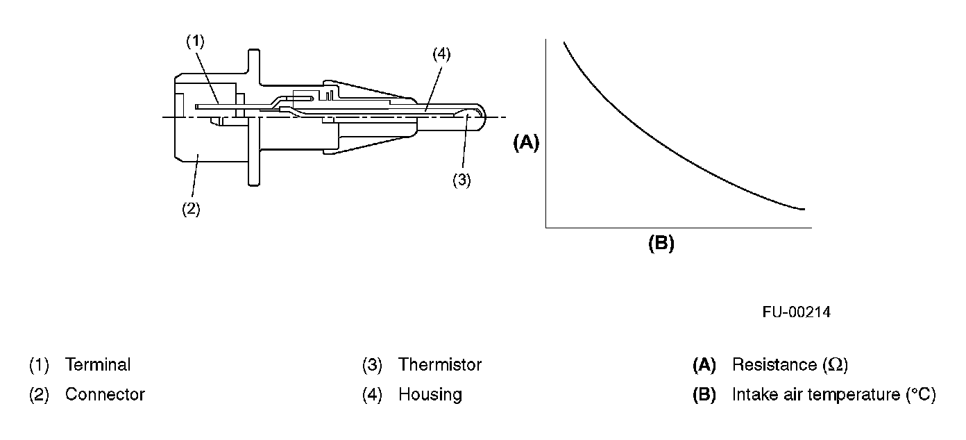 The intake air temperature sensor is located in the air cleaner case and detects the temperature of the intake air introduced through the air intake duct. The ECM uses the resistance signal from the sensor to correct the fuel injection amount.