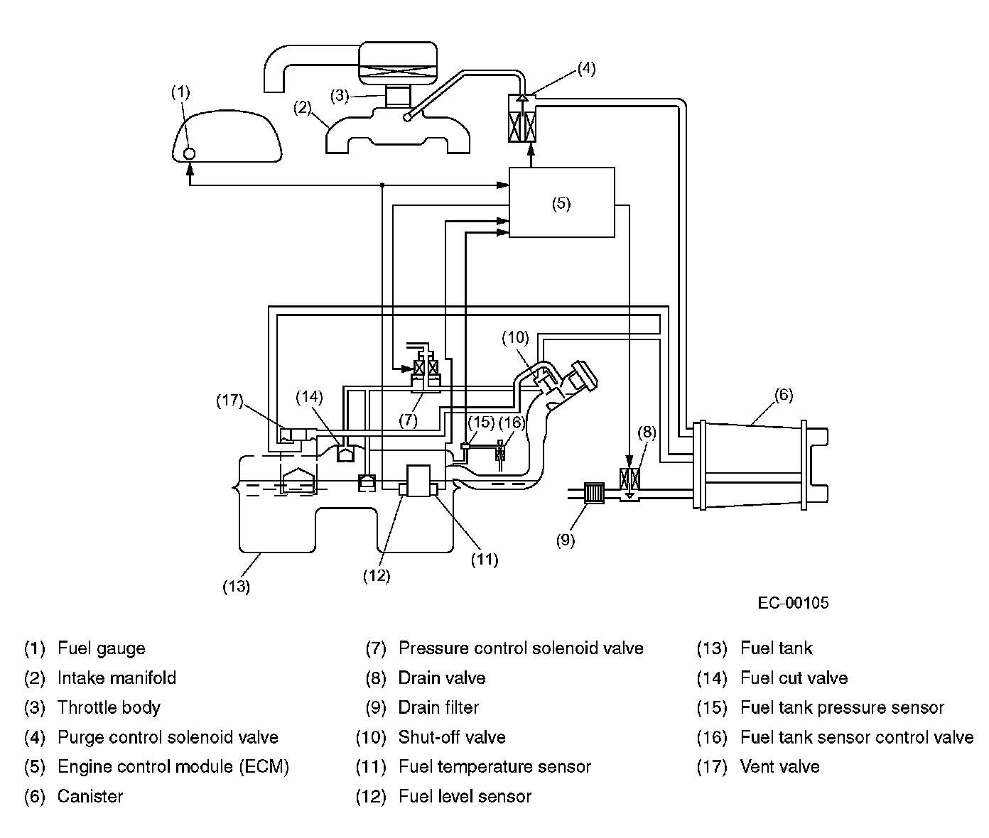 - The evaporative emission control system prevents fuel vapors from escaping into atmosphere. This system includes a canister, purge control solenoid valve, fuel cut valve, and the lines connecting them.