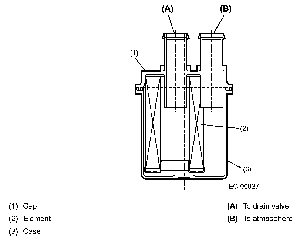 The drain valve is located on the line connecting the drain filter and canister, just below the drain filter.The drain valve is forcibly closed by a signal from the ECM while the evaporation system diagnosis is being conducted.