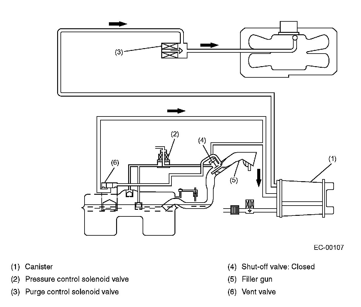 As the fuel enters the fuel tank, the tank inside pressure increases. When the inside pressure becomes higher than the atmospheric pressure, the port of the vent valve opens, allowing the fuel vapors to be introduced into the canister through the vent line. The fuel vapors are absorbed by charcoal in the canister, so the air discharged from the drain valve contains no fuel. When a filler gun is inserted, the shut-off valve closes the evaporation line.