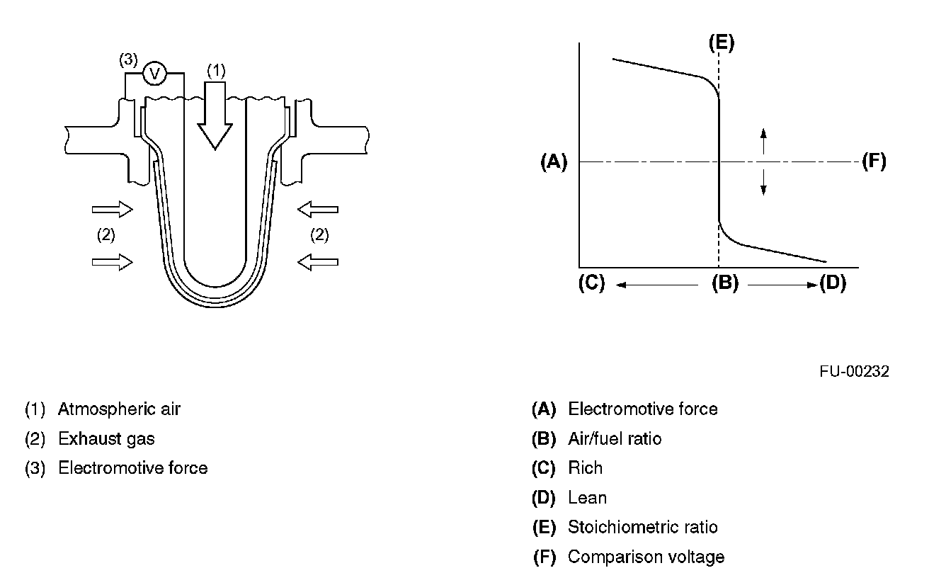 - When a lean air-fuel mixture is burnt in the cylinder, relatively large amount of oxygen remains in the exhaust gases even after the catalytic action, and this results in a small difference in the oxygen ion concentration between the tube's internal and external surfaces. The electromotive force in this case is very small.