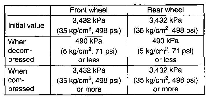7. Read values indicated on the pressure gauge and check if the fluctuation of the values between decompression and compression meets the standard values. Also check if any irregular brake pedal tightness is felt.
