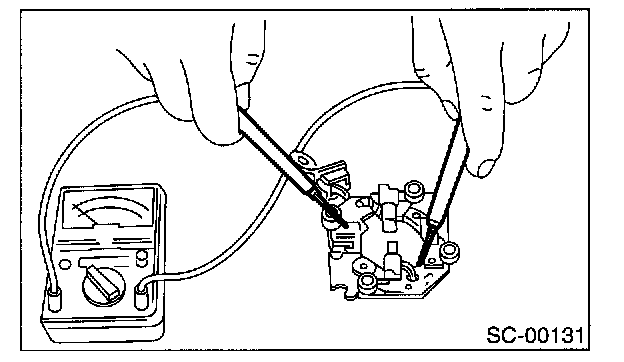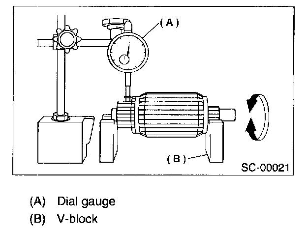 Using circuit tester, touch one probe to the commutator segment and the other to shaft. If there is no continuity, it is normal. If there is a continuity armature is grounded. Replace armature if it is grounded.