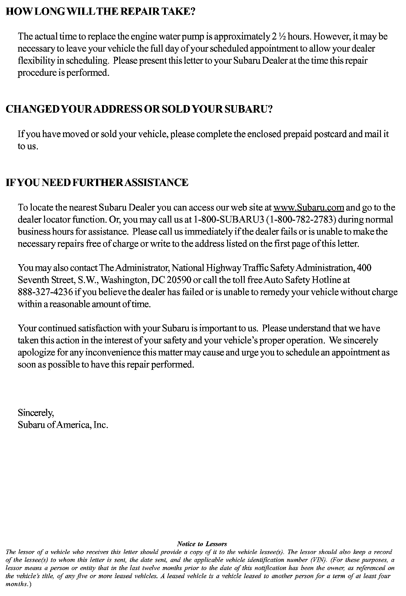 Any Authorized Subaru Dealer failing to perform the applicable service procedures defined in this bulletin to correct all affected vehicles in their inventory (new, used, demo) prior to the vehicle being placed in service may be subject to civil penalties of up to $5,000 per violation (i.e., for each vehicle), as provided in 49 USC 30165(a) of the Safety Act, and will also be in breach of the Subaru Dealer Agreement.