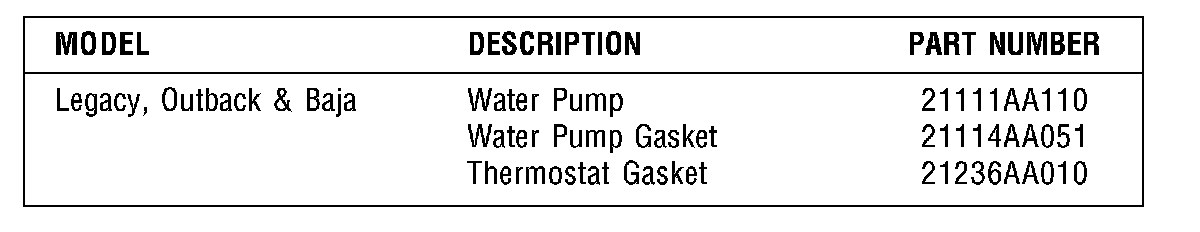 Replace the engine water pump following the procedures published in the applicable Subaru Service Manual.
