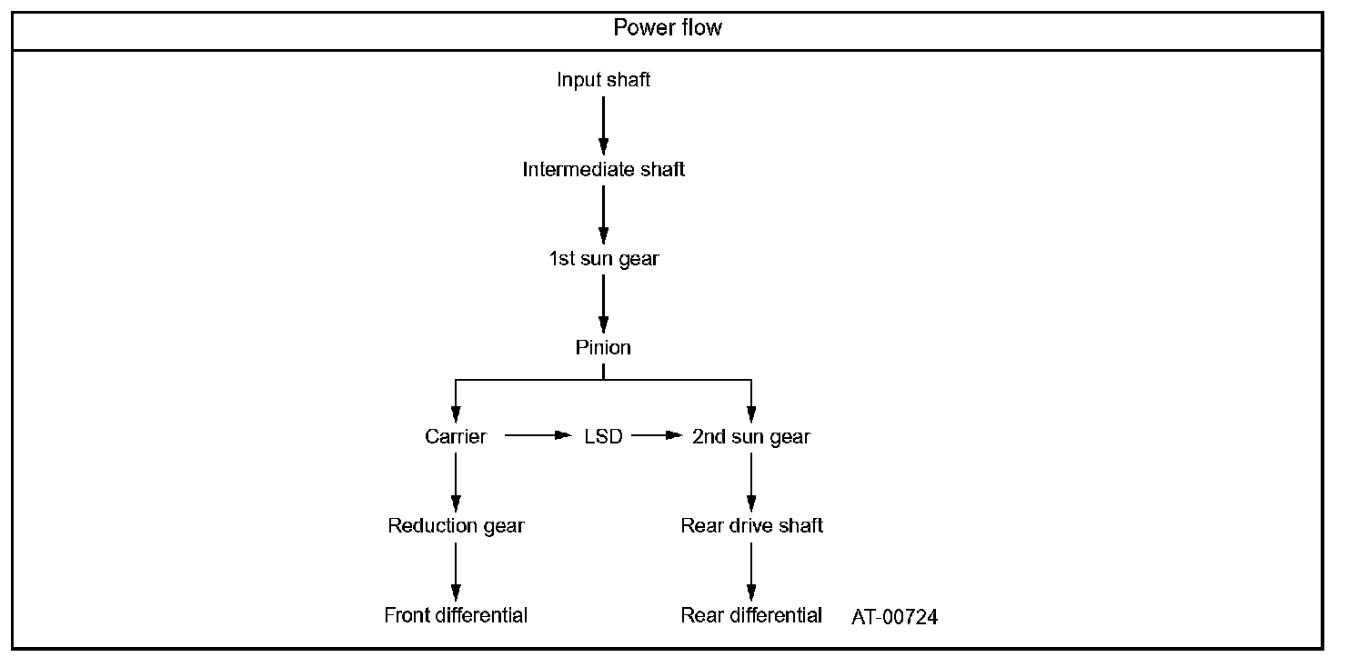 The input torque is transmitted to the 1st sun gear of the center differential through the intermediate shaft. From the 1st sun gear, the torque is transmitted through the 1st pinion to the output carrier in the front wheel output components, and through the 2nd pinion to the 2nd sun gear in the rear wheel output components.