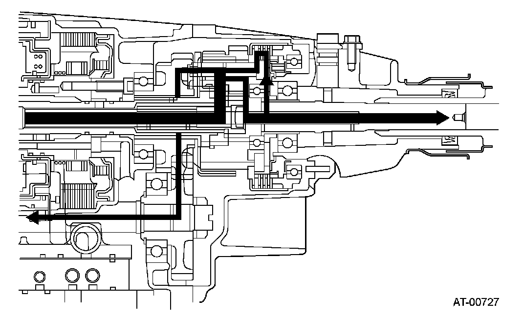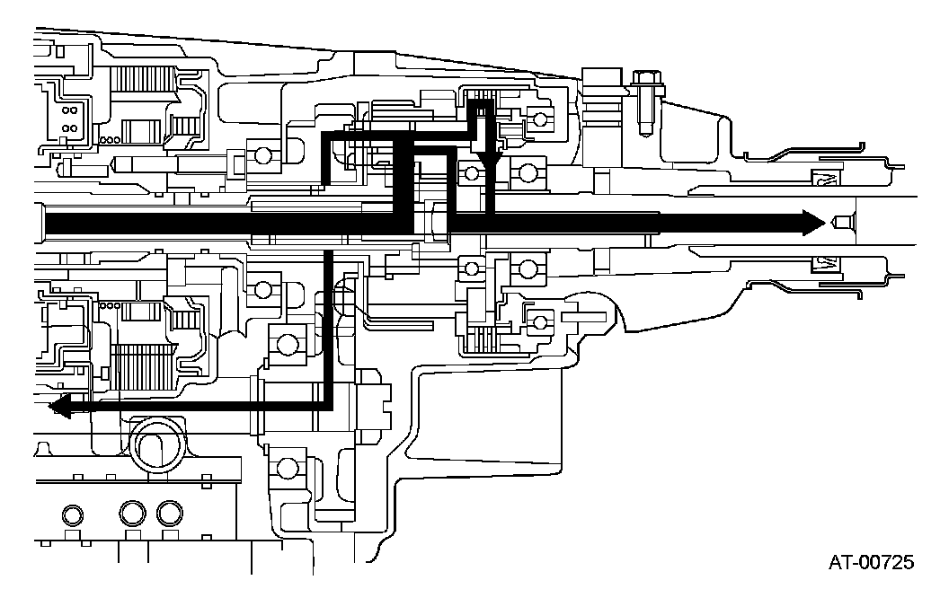 The center differential is a compound planetary gear set without internally-toothed gears. The input torque from the automatic transmission is transmitted to the input element of the center differential (1st sun gear). The front wheel output elements of the center differential are connected to the carrier and the rear wheel output elements are connected to the 2nd sun gear.