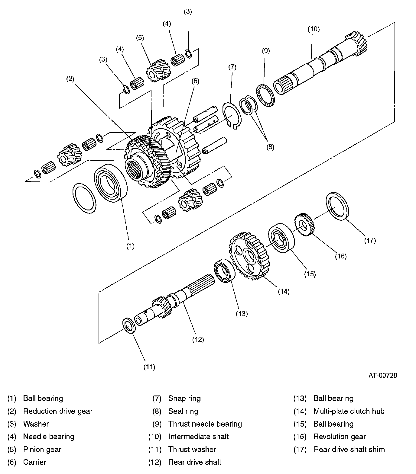 The rear drive shaft has drilled oil passages for lubrication of multi-plate clutch and extension bushing and ball bearing in it.