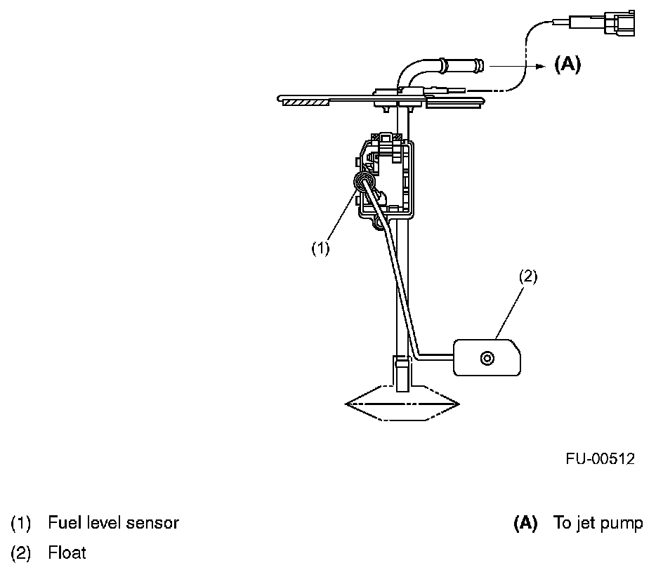 SUB-COMPARTMENT FUEL LEVEL SENSORThis sensor detects the level of the fuel in the sub-compartment (the compartment in which the fuel pump is not located) and acts as part of the fuel transfer line when the jet pump is in operation to maintain the fuel in both compartments at the same level.