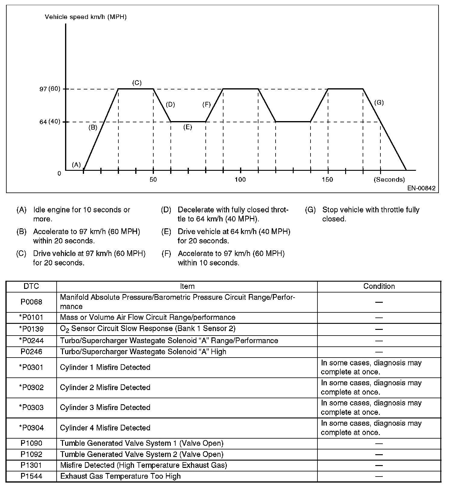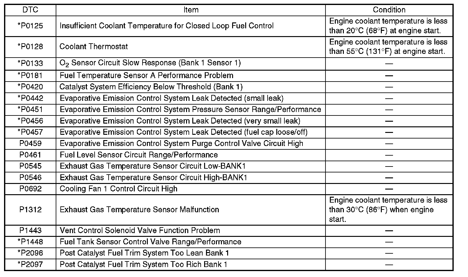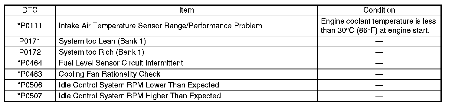 - Carry out the diagnosis which is marked* on DTC twice, then, after finishing first diagnosis, stop the engine and do second time at the same condition.