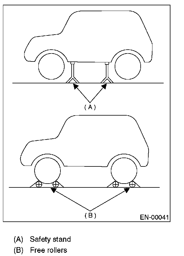 - In order to prevent the vehicle from slipping due to vibration, do not place any wooden blocks or similar items between the safety stands and the vehicle.