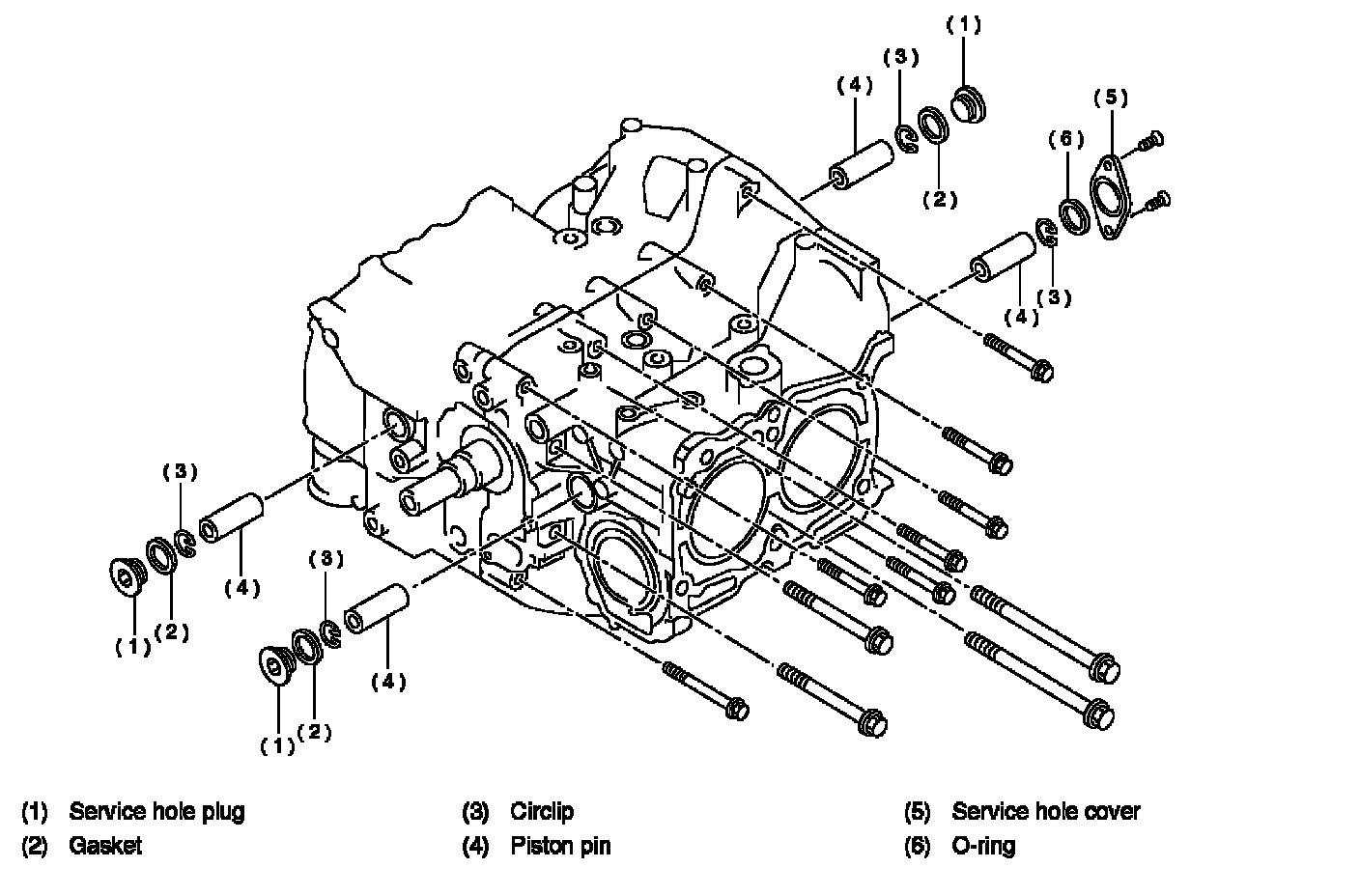25. Rotate the crankshaft to bring #1 and #2 pistons to bottom dead center position, and then remove the piston circlip through service hole of #1 and #2 cylinders.
