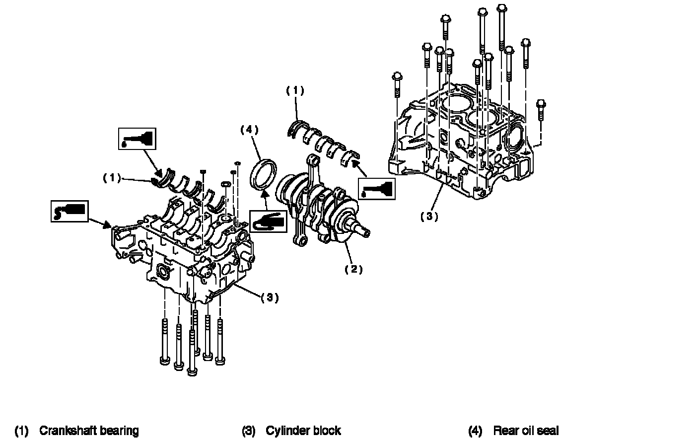 1. Remove oil in the mating surface of bearing and cylinder block before installation. Also apply a coat of engine oil to crankshaft pins.