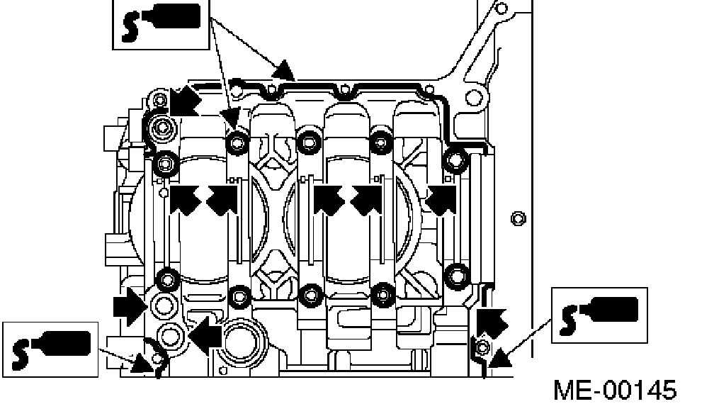 5. Tighten the 10 mm cylinder block connecting bolts in alphabetical sequence shown in the figure. (LH side)
