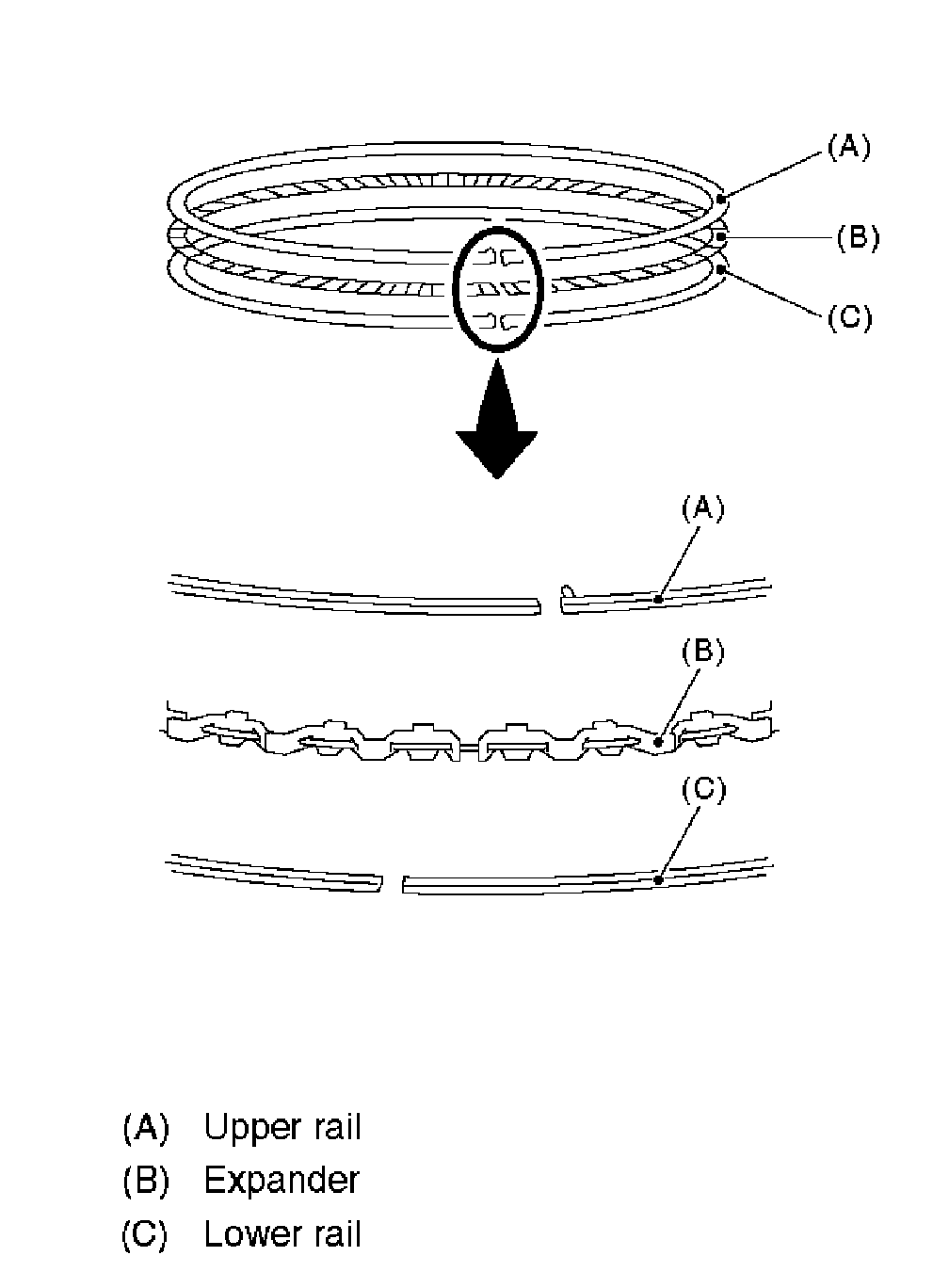 ^ Oil ring consists of upper rail, expander and lower rail. When installing on piston, be careful of each rail's direction.