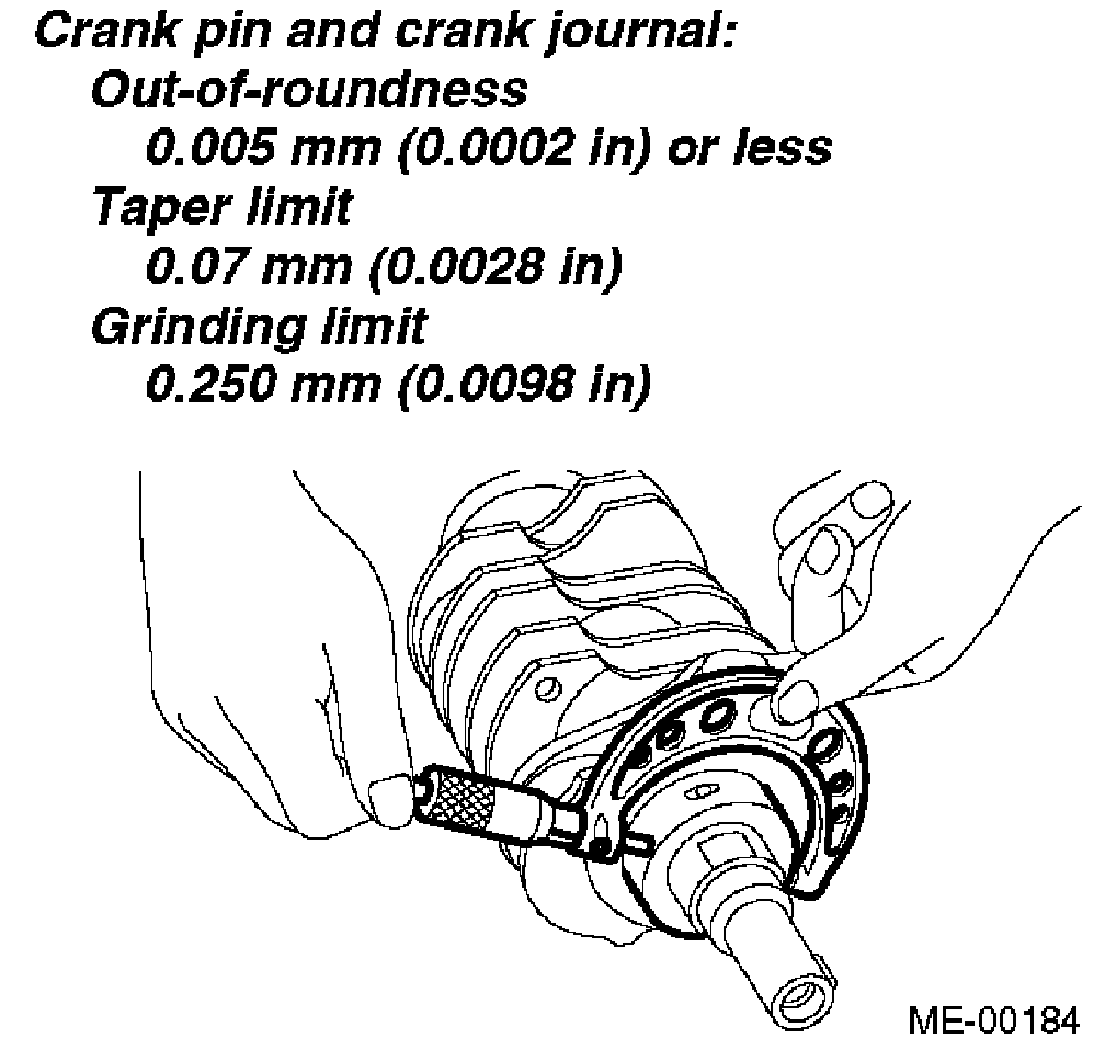 3. Inspect the crank journal and crank pin for wear. If they are not within the specifications, replace the bearing with a suitable (undersize) one, and then replace or recondition the crankshaft as necessary. When grinding the crank journal or crank pin, finish them to specified dimensions according to the undersize bearing to be used.