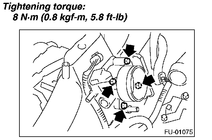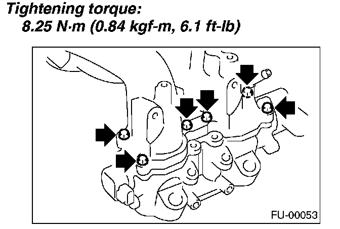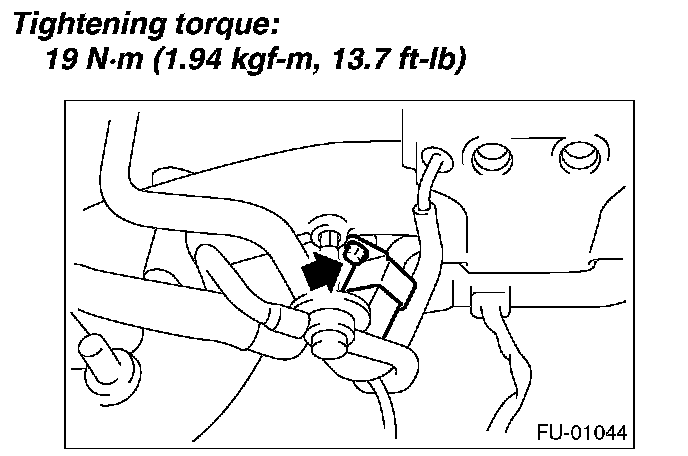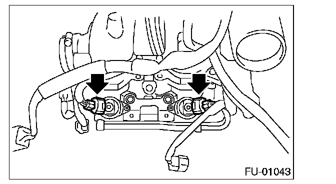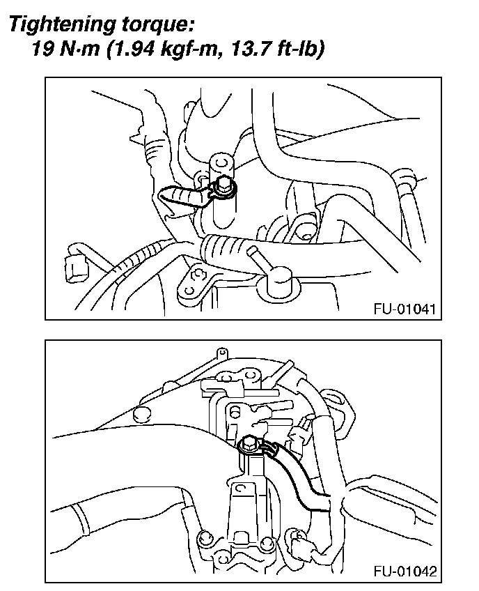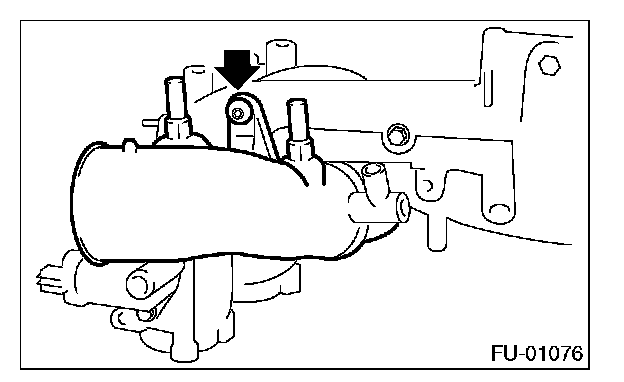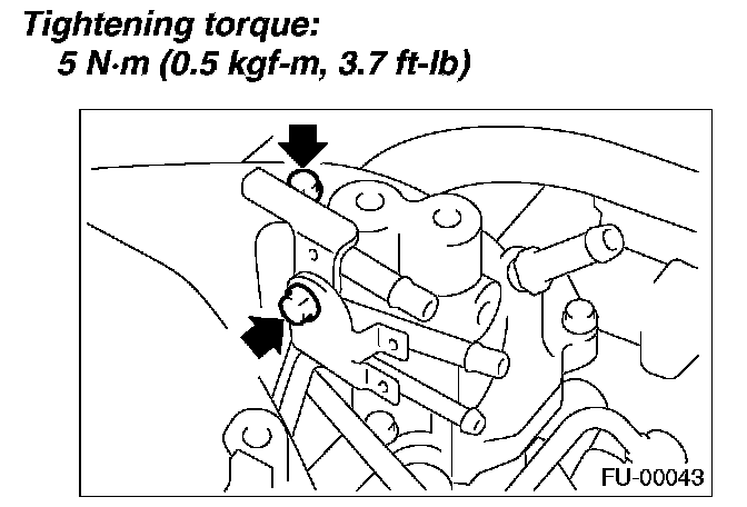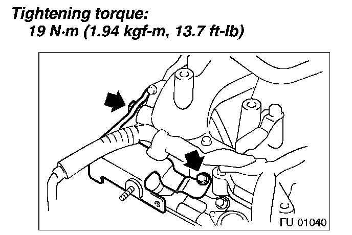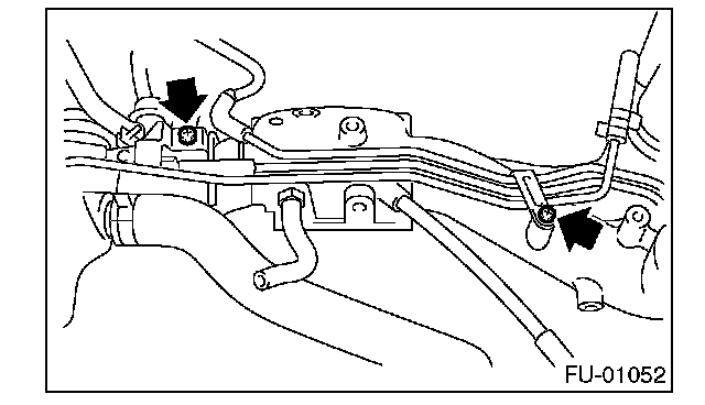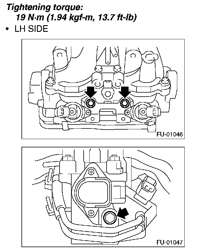 11. Tighten the two bolts which install the fuel pipes on the left side of intake manifold.