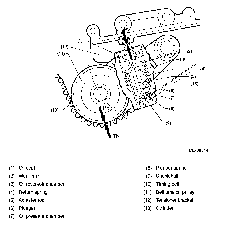 The thrust force F resulting from extension of the adjuster rod applies a counterclockwise torque to the tensioner bracket, which causes the belt tension pulley at its end to turn in the same direction. This applies tensioning pressure Pb to the timing belt.