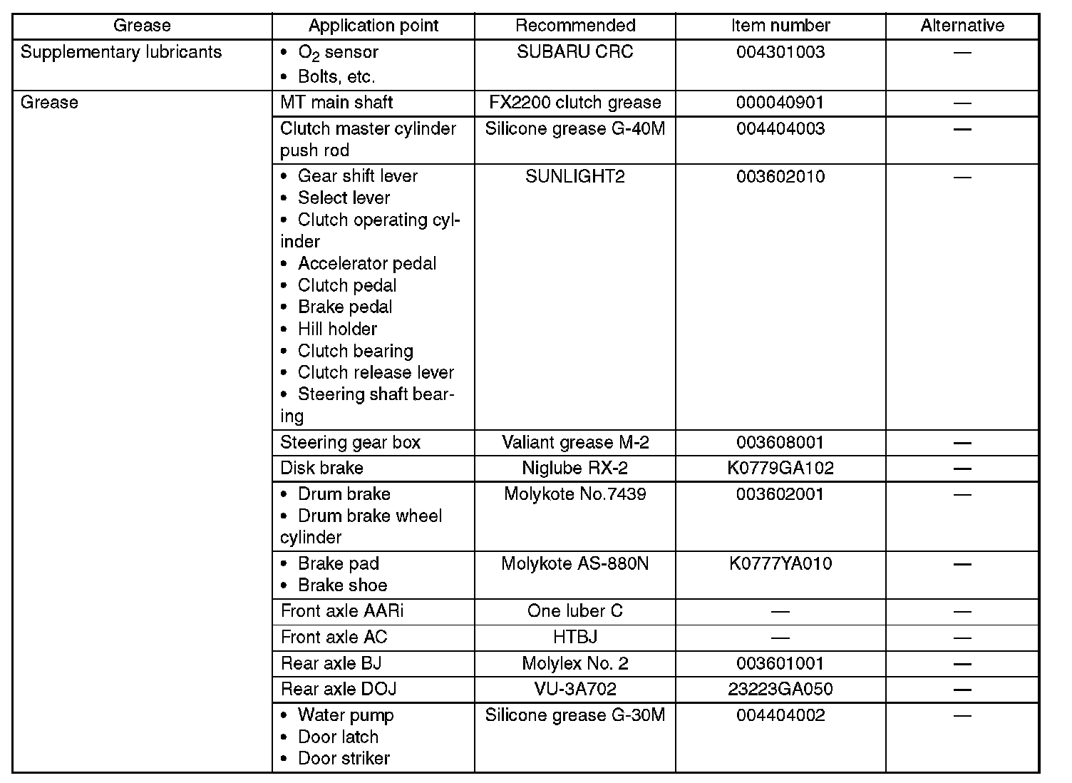 Use the grease and supplementary lubricants shown in the table.
