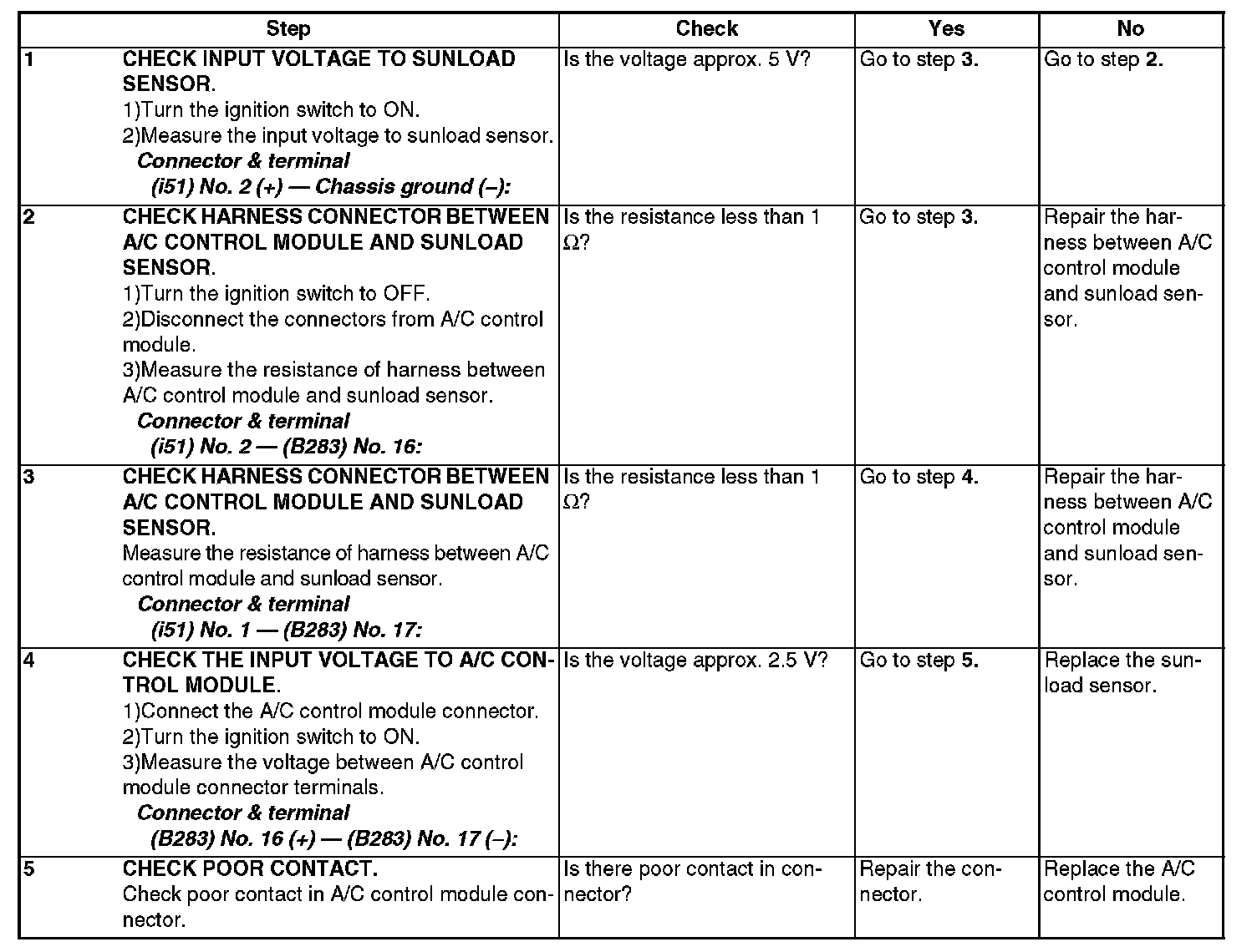 NOTE: When the sunload sensor is checked indoors or in the shade, open circuit might be indicated. Always check the sunload sensor at a place where sun shines directly on it.