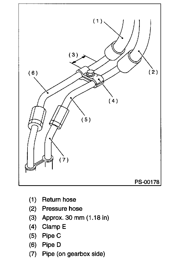 13. Finally check clearance between pipes and/or hoses, as shown above. If the clearance between cruise control pump and power steering hose is less than 10 mm (0.39 inch), proceed as follows: