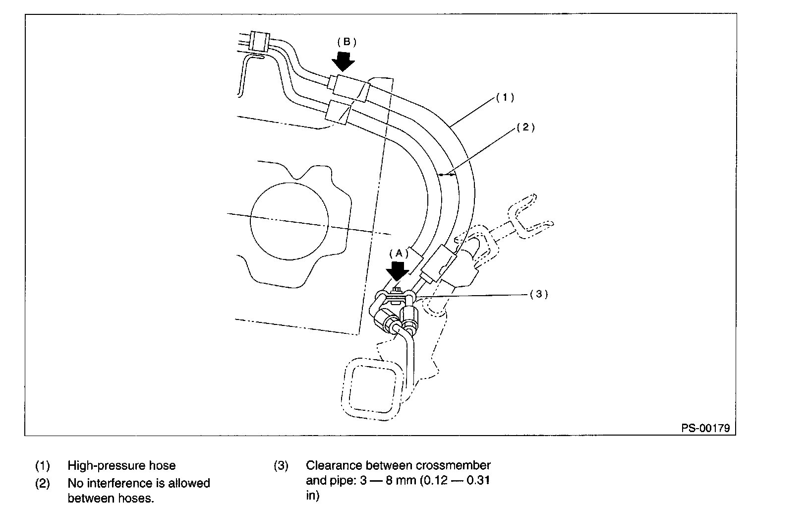 2. Check that clearance between cruise control pump and power steering hose is at least 10 mm (0.39 inch). If it is not, bend section (B) down until a clearance of at least 10 mm (0.39 inch) is obtained.