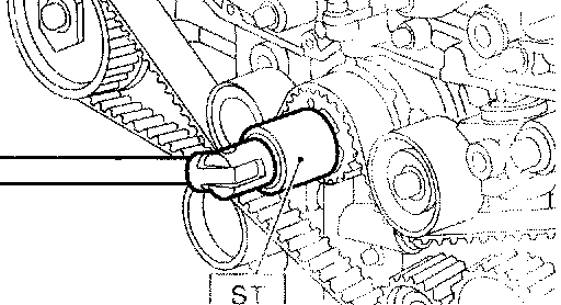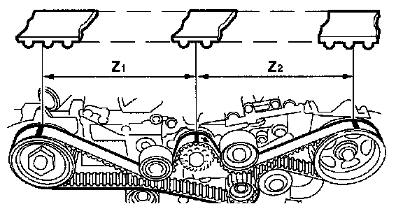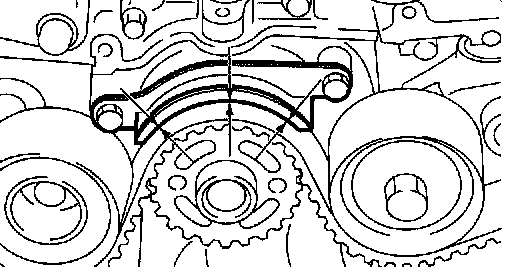 2) Using white paint, put alignment and/or arrow marks on the timing belts in relation to crankshaft sprocket and camshaft sprockets