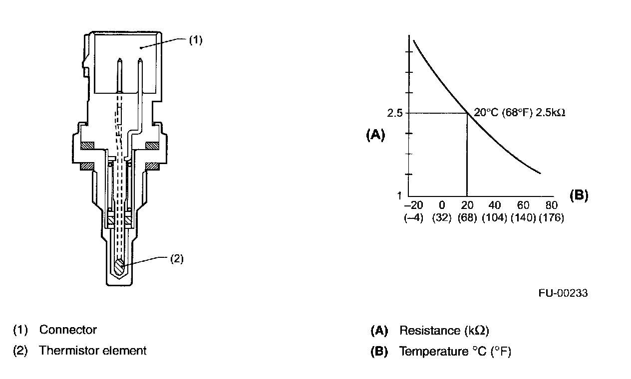 ENGINE COOLANT TEMPERATURE SENSORThe engine coolant temperature sensor is located on the engine coolant pipe. The sensor uses a thermistor whose resistance changes inversely with temperature. Resistance signals as engine coolant temperature information are transmitted to the ECM to make fuel injection, ignition timing, purge control solenoid valve and other controls.