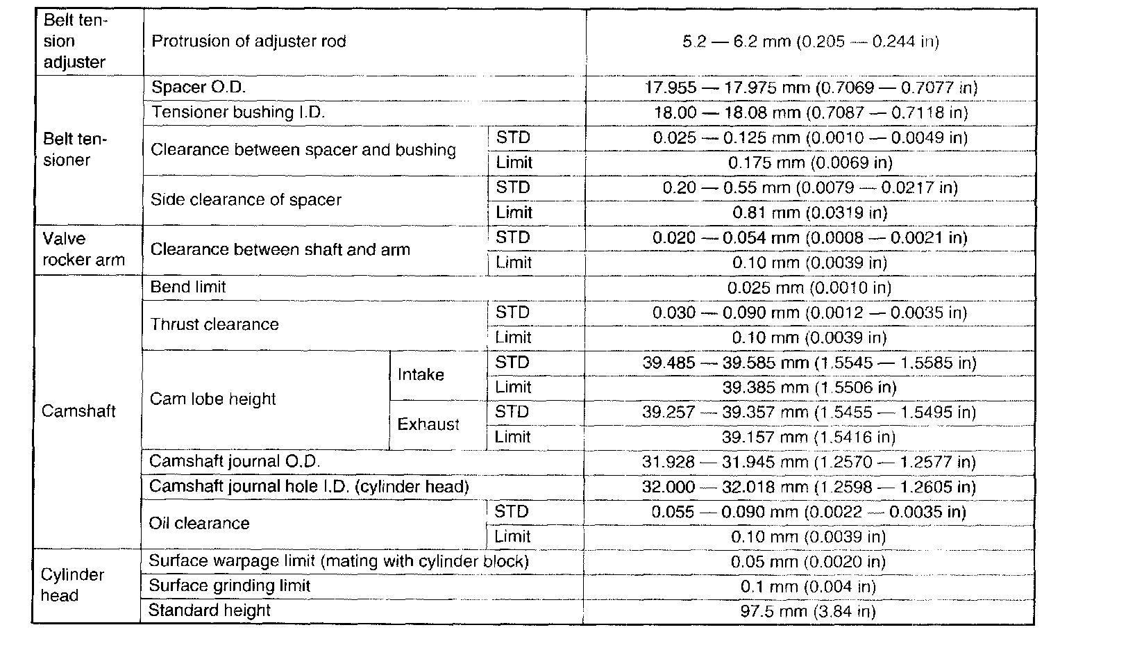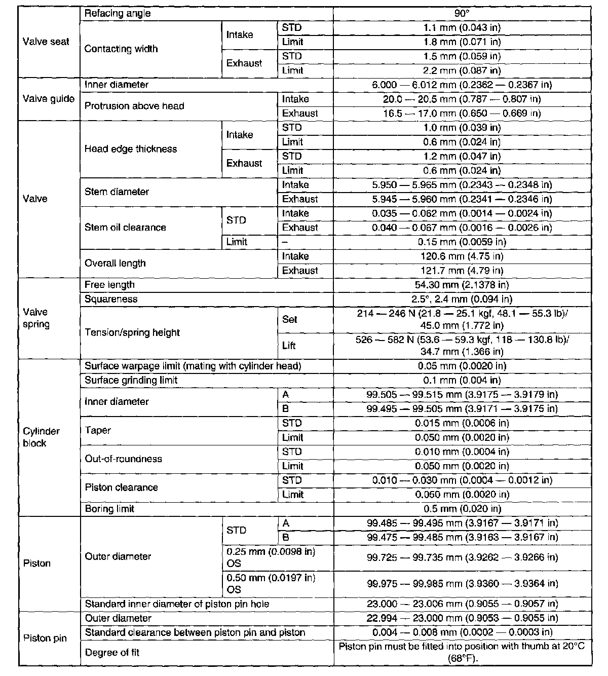SPECIFICATIONSNOTE: US: Undersize OS: Oversize