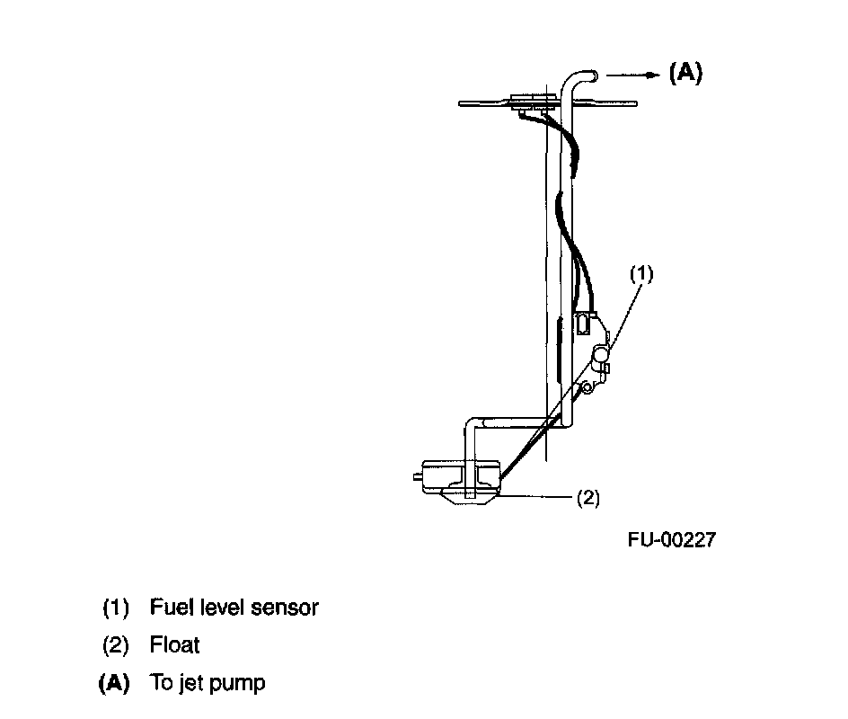 SUB-COMPARTMENT FUEL LEVEL SENSORThis sensor detects the level of the fuel in the sub-compartment (the compartment in which the fuel pump is not located) and acts as part of the fuel transfer line when the jet pump is in operation to maintain the fuel in both compartments at the same level.